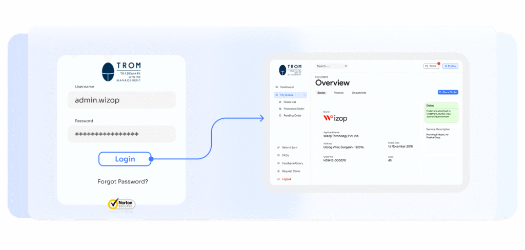Welcome to your central hub. A TROM Account is your secure online platform for simplifying your brand's trademark journey, making it completely transparent and under your control.